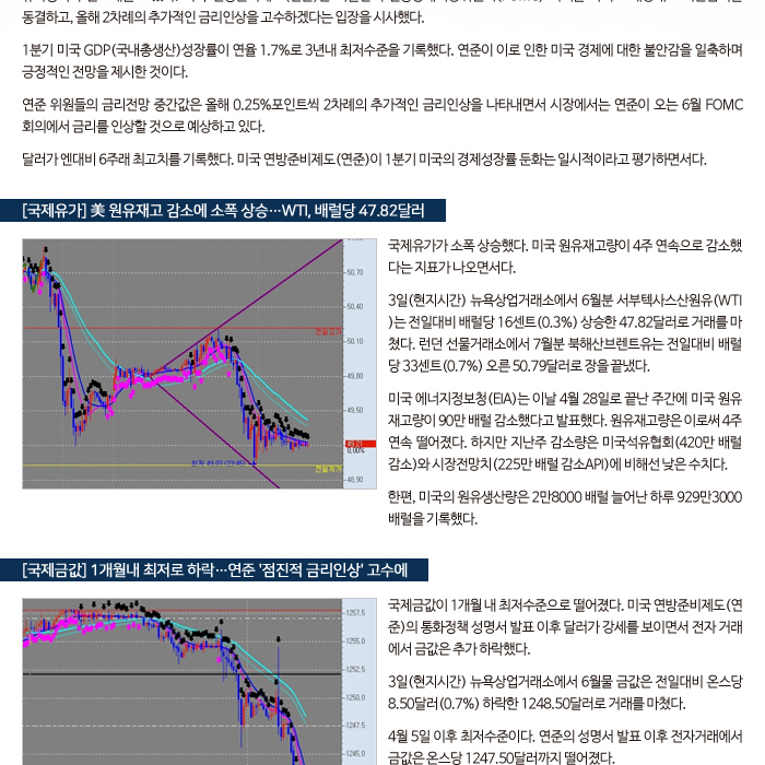 [미증시 마감][뉴욕마감]뉴욕증시 혼조세..연준, 예상대로 금리동결 뉴욕증시가 혼조세를 보였다. 미국 연방준비제도(연준)는 이틀간의 연방공개시장위원회(FOMC) 회의를 마치고 예상대로 기준금리를 동결하고, 올해 2차례의 추가적인 금리인상을 고수하겠다는 입장을 시사했다. 1분기 미국 GDP(국내총생산)성장률이 연율 1.7%로 3년내 최저수준을 기록했다. 연준이 이로 인한 미국 경제에 대한 불안감을 일축하며 긍정적인 전망을 제시한 것이다. 연준 위원들의 금리전망 중간값은 올해 0.25%포인트씩 2차례의 추가적인 금리인상을 나타내면서 시장에서는 연준이 오는 6월 FOMC 회의에서 금리를 인상할 것으로 예상하고 있다. 달러가 엔대비 6주래 최고치를 기록했다. 미국 연방준비제도(연준)이 1분기 미국의 경제성장률 둔화는 일시적이라고 평가하면서다. [국제유가, 美 원유재고 감소에 소폭 상승...WTI, 배럴당 47.82달러] 국제유가가 소폭 상승했다. 미국 원유재고량이 4주 연속으로 감소했다는 지표가 나오면서다. 3일(현지시간) 뉴욕상업거래소에서 6월분 서부텍사스산원유(WTI)는 전일대비 배럴당 16센트(0.3%) 상승한 47.82달러로 거래를 마쳤다. 런던 선물거래소에서 7월분 북해산브렌트유는 전일대비 배럴당 33센트(0.7%) 오른 50.79달러로 장을 끝냈다. 미국 에너지정보청(EIA)는 이날 4월 28일로 끝난 주간에 미국 원유재고량이 90만 배럴 감소했다고 발표했다. 원유재고량은 이로써 4주 연속 떨어졌다. 하지만 지난주 감소량은 미국석유협회(420만 배럴 감소)와 시장전망치(225만 배럴 감소API)에 비해선 낮은 수치다. 한편, 미국의 원유생산량은 2만8000 배럴 늘어난 하루 929만3000배럴을 기록했다. [국제금값, 1개월내 최저로 하락...연준 '점진적 금리인상' 고수에] 국제금값이 1개월 내 최저수준으로 떨어졌다. 미국 연방준비제도(연준)의 통화정책 성명서 발표 이후 달러가 강세를 보이면서 전자거래에서 금값은 추가 하락했다. 3일(현지시간) 뉴욕상업거래소에서 6월물 금값은 전일대비 온스당 8.50달러(0.7%) 하락한 1248.50달러로 거래를 마쳤다. 4월 5일 이후 최저수준이다. 연준의 성명서 발표 이후 전자거래에서 금값은 온스당 1247.50달러까지 떨어졌다. 연준은 이날 연방공개시장위원회(FOMC) 회의 이후 성명서를 통해 기준금리를 동결했다. 또한 올해 점진적인 금리인상 계획을 고수할 것임을 시사했다. 높은 금리는 달러 가치를 높이고, 강달러는 달러로 표시되는 금값을 떨어뜨린다. 7월물 은값은 전일대비 온스당 28.5센트(1.7%) 떨어진 16.546달러로 장을 마쳤다. 1월초 이후 최저가다. 7월물 구리는 전일대비 파운드당 3.5% 떨어진 2.544달러로 거래를 마쳤다. 일간 하락폭으로는 2015년 이후 최대다. 7월물 백금은 전일대비 온스당 2.3% 하락한 904.40달러로 6월물 팔라듐은 전일대비 온스당 1.8% 떨어진 799.30달러로 마감했다.