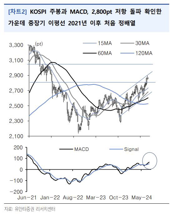 정 연구원은 “지난 6월 말에 2800선 부근에서 플랫폼 형성 후 상승해 단기로 조정받더라도 2800포인트 수준의 지지력은 강할 것으로 예상되고 중장기 상승 국면으로 당분간 이어질 가능성이 높다는 판단이다”고 강조했다.